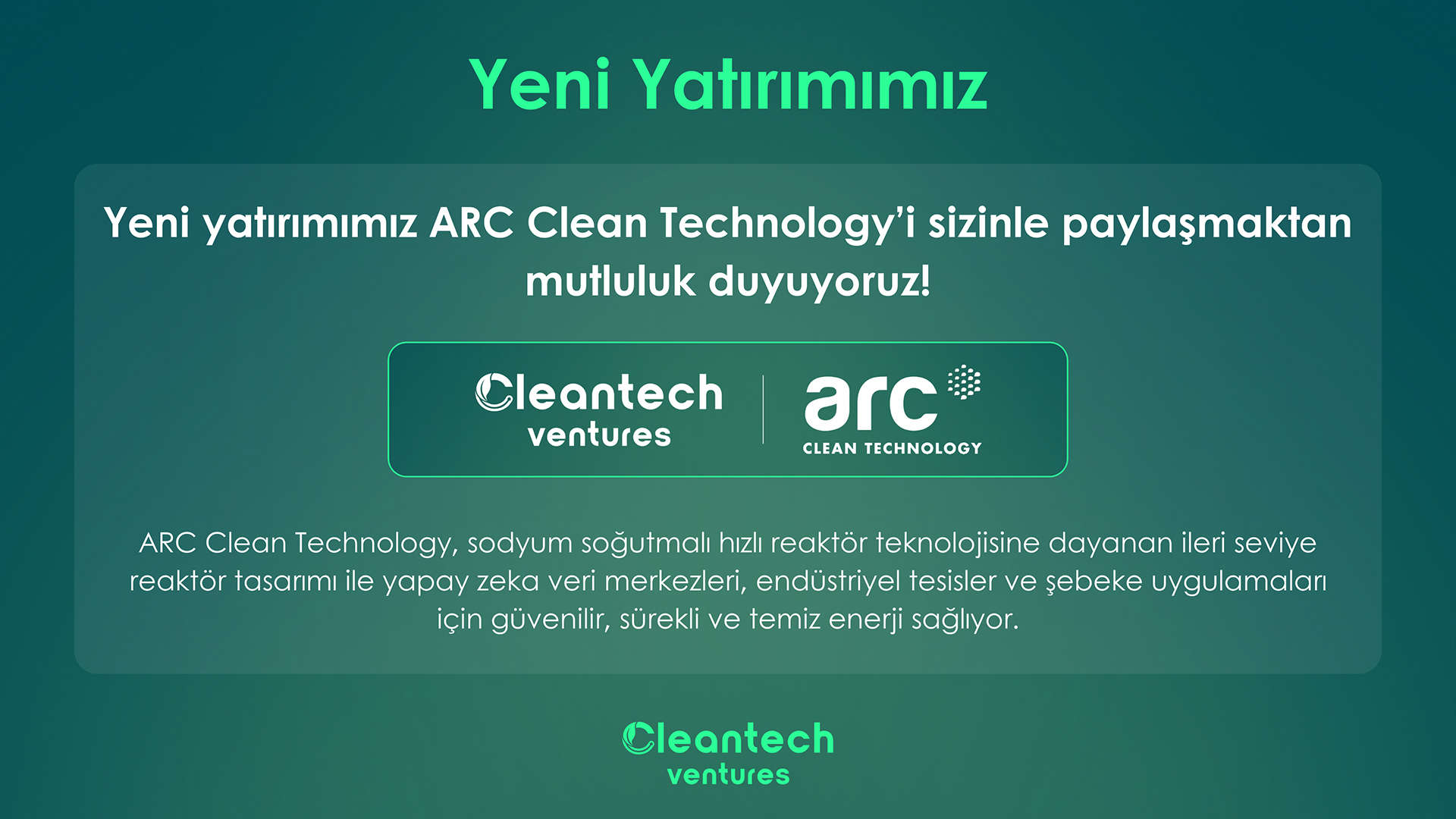 Cleantech Ventures Yönetici Direktörü Eren Aşkın yatırım hakkında görüşlerini şu cümleler ile belirtti: “ARC Clean Technology, temiz, güvenilir ve ölçeklenebilir enerjiye duyulan küresel ihtiyacın hızla arttığı bir dönemde gerçek bir altyapı çözümü sunuyor. ARC’a yaptığımız yatırım, sürdürülebilirlik odaklı teknolojilere yönelik stratejimizi güçlendirirken aynı zamanda geleceği şekillendirecek teknolojileri destekleme vizyonumuzu yansıtıyor. Şirketin geliştirdiği teknolojinin pazarda dönüşüm yaratma potansiyeline inanıyoruz ve küresel ölçekte büyümesini hızlandıracak bu aşamada ARC ekibini desteklemekten mutluluk duyuyoruz.”